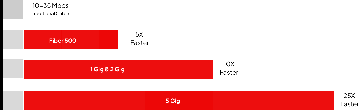 Frontier Fiber Internet uses advanced light-based technology to transmit data faster than traditional cable, delivering blazing-fast speeds up to 5,000 Mbps. Experience smoother streaming, lag-free gaming, and an ultra-responsive online experience with a powerful Frontier Internet connection!